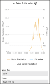 Description: Solar radiation visualisations depict the average incoming energy received at the surface, highlighting patterns shaped by day length, sun angle, and short-term weather events such as cloud cover (yellow line). The UV index (blue line) represents the intensity of ultraviolet radiation at the surface, measured at 30-minute intervals. This metric provides a clear indication of how UV exposure fluctuates throughout the day and season, driven by sun angle, cloud cover, and atmospheric conditions. Monitoring the UV index helps users understand periods of high ultraviolet risk.