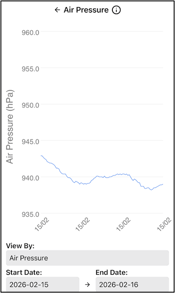 Why its Useful: Fluctuations in air pressure are closely tied to changing weather conditions such as the passage of fronts, onset of storms, or clearing skies. Tracking these patterns can support planning for fieldwork, as sudden drops in pressure often indicate incoming precipitation or increased wind activity, while steady or rising pressure suggests stable conditions. By integrating air pressure data alongside other environmental parameters, users gain a more comprehensive understanding of local weather dynamics and their potential impact on crop management decisions.