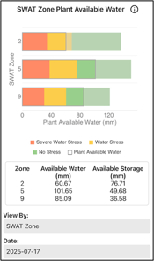 Description: Shows how much water is available to the crop at different soil depths, highlighting how moisture is distributed through the profile. Shaded areas indicate current PAW, while background colors show total PAW capacity and stress levels. This helps identify whether moisture is near the surface for germination, in the early root zone for establishment, or deeper for late‑season use.