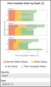 Why It’s Useful: This visual describes how much of your soil’s water‑holding capacity is currently filled and whether your crop is experiencing any level of water stress. This view is a high‑level snapshot and does not show how moisture is distributed by depth within the soil profile, so it should be used alongside the depth‑based charts for a complete picture.