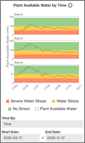 Description: Displays plant‑available water (mm) within the maximum root zone over time (as specified by the date selectors) for each SWAT zone. The black line shows seasonal PAW changes, while background colors indicate total PAW capacity and stress levels.
