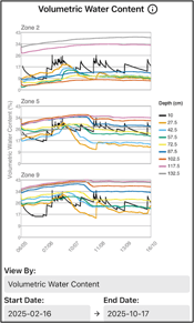 Why It’s Important: Volumetric water content is the basis for all of the plant available water metrics reported in this app. This information provides an important, but complex, perspective of water dynamics. It is an important perspective to understand soil profile differences and can be helpful in system diagnostics.