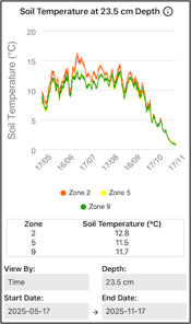 Why It’s Useful: Soil temperature is a critical indicator for timing seeding. Because the seedbed is shallower and generally warmer than the shallowest (23.5 cm) depth, reaching recommended temperatures at this depth occur later. Comparing temperatures across SWAT zones helps identify which parts of the field warm earlier or later.
