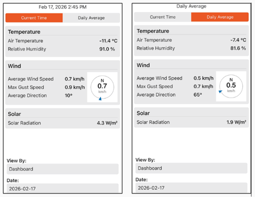 The Current Time dashboard tab provides a quick look at the current weather conditions. It reports the last observed weather conditions for the preceding half hour. The Daily Average tab provides a quick look at daily average weather conditions for the selected date. Both of these tabs provide air temperature relative humidity, wind speed/direction, max gust (maximum wind speed), and solar radiation for the interval defined by the Current Time, or Daily Average tab you are in.