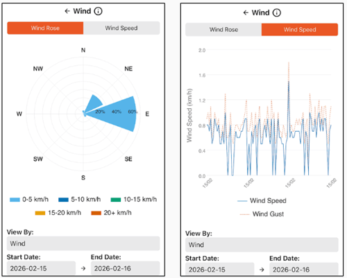 Weather data visualisation: From the Dashboard tiles, or the “View By” dropdown, the app also provides more detailed visualisations of these weather variables over time.