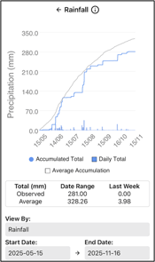 Why it’s useful: Understanding how in‑season rainfall compares to historical patterns is essential for interpreting soil moisture distribution, crop stress, and overall yield potential. Differences in rainfall intensity also have major agronomic implications. High‑intensity rainfall often exceeds the soil’s infiltration capacity, leading to greater surface runoff and accumulation of moisture in lower‑lying SWAT zones, while contributing less to deep soil recharge in upland areas. High intensity rainfall is indicated by a straight upward increase in the blue line (example between 15/07 and 15/08). In contrast, low‑intensity rainfall is more easily absorbed, allowing water to infiltrate uniformly and recharge soil water reserves more evenly across all landscape positions.