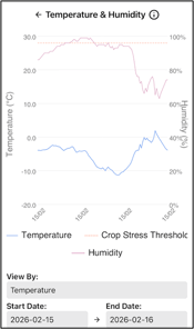 Why it’s Useful: Tracking air temperature and humidity together provides valuable insights for managing field operations and mitigating crop risks. Knowing when temperatures approach heat stress thresholds, or when humidity rises to levels conducive to disease development, allows for better agronomic decisions. By visualising temperature and humidity together, the charts help explain daily evaporation rates, plant transpiration, and the likelihood of dew formation, which can all influence crop health and disease risk.