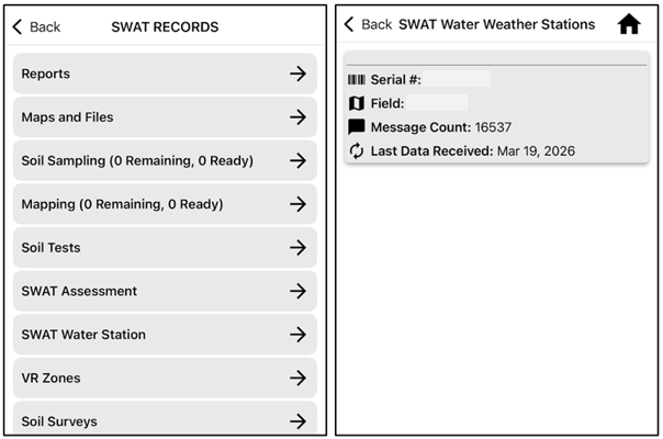 The information reported by the SWAT Water Station is reported through the SWAT RECORDS interface of the Mobile App. Data for a SWAT Water station is connected to the app at a farm level and will only be visible to users with the permissions to sync the respective farm. The SWAT Water Station link leads to a page that lists the available stations for that farm with field names and date of last received data.